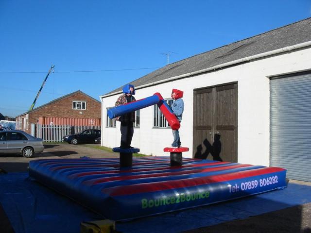 Provided With 18 FT x 18 FT Inflatable Base 2 Gladiator Sticks and Also Comes With Adjustable Head Gear Protection.