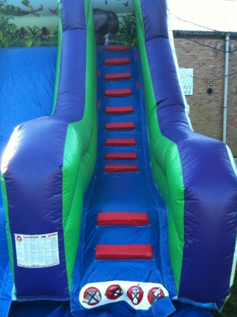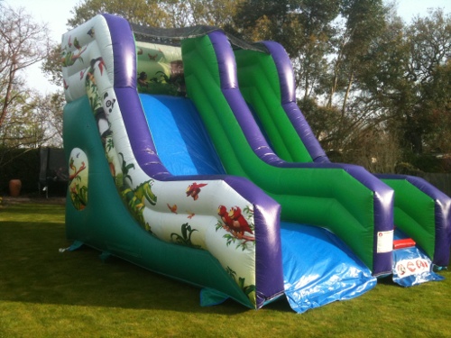A fully featured inflatable Slide with sculptured walls, netted rain cover, superb digitally printed artwork in an eye-catching Jungle Theme.